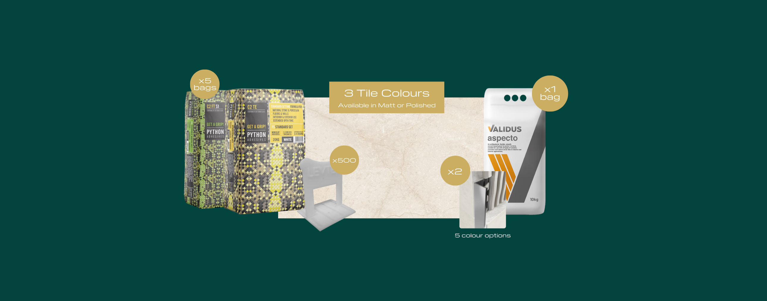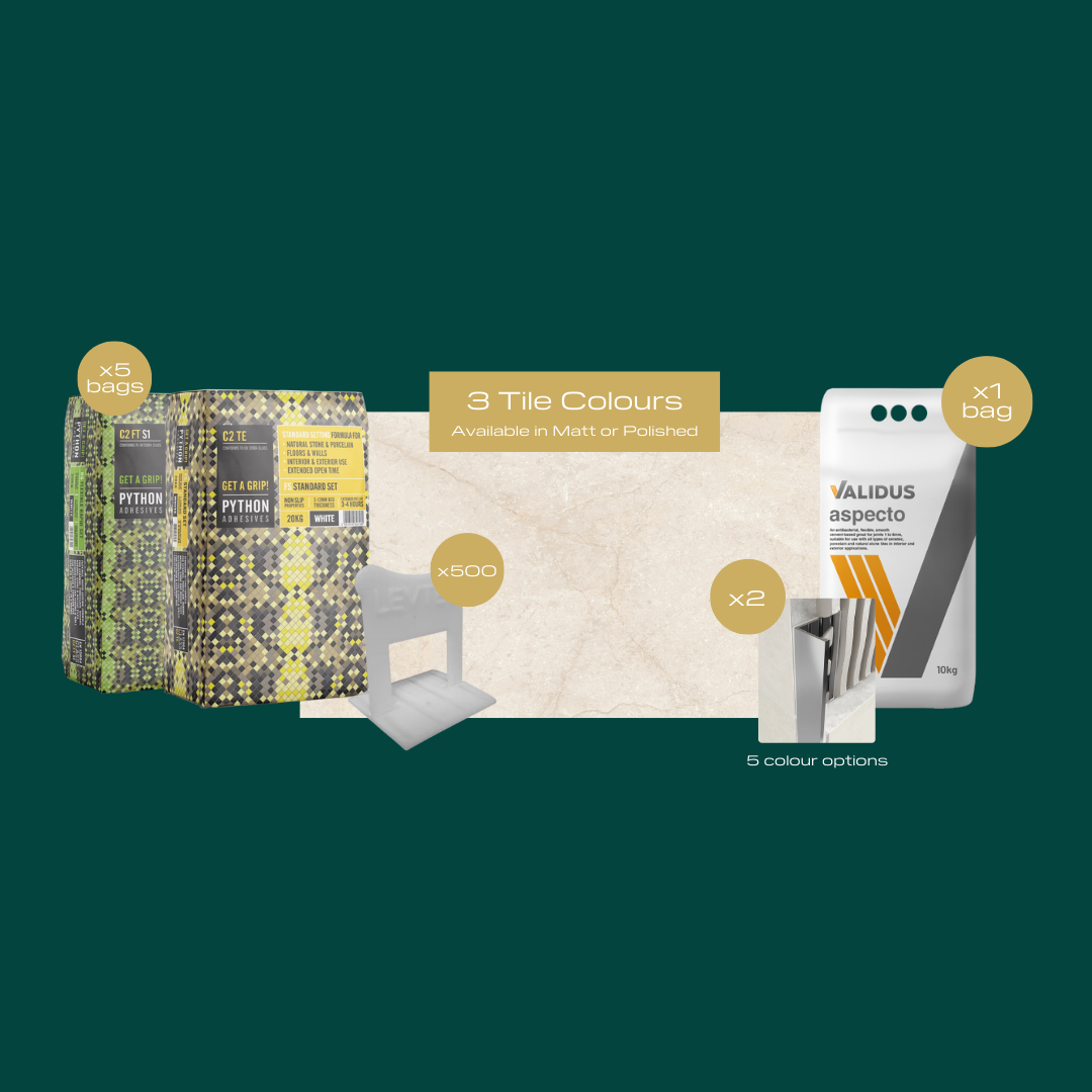 Each tiling package includes premium tiles, adhesives, clips, grouts, and trims. The specific quantities depend on the package size you choose, ranging from 15 to 35 square meters.